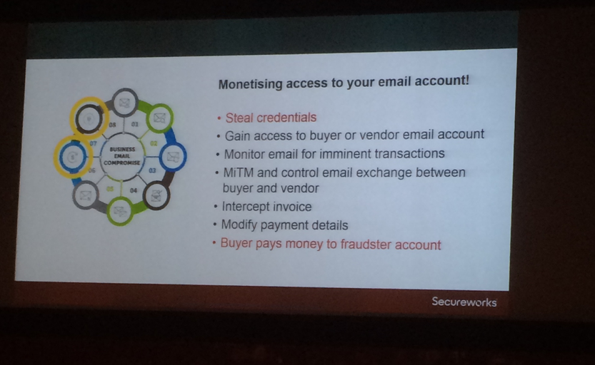 Next talk was business email compromises by Nigerian scammers, Chris Yule (CTU). Covering the GOLD GALEON group, Business email scam methods in steps.